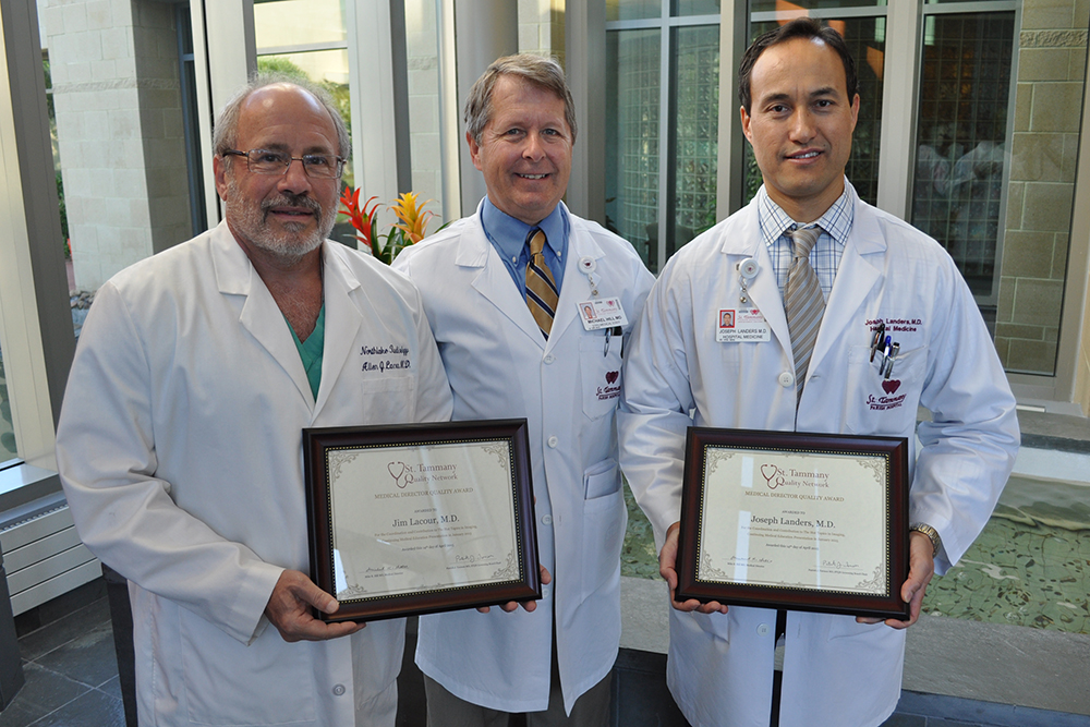 Photo1: Dr. Mike Hill, STQN Medical Director, center, presents the St. Tammany Quality Network’s second quarter Medical Director Award to Drs. Allen Lacour, left, and Joseph Landers.