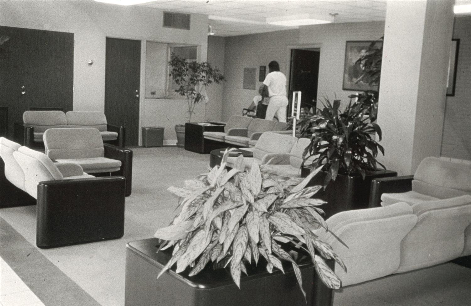 LOBBY NO. 2: By the late 1970s, the hospital had already undergone numerous expansions and updates. That included a renovation of the lobby and main entrance. As this photo shows, gone were the two heavy wooden doors from the original lobby, replaced by a more modern steel-and-glass entryway.