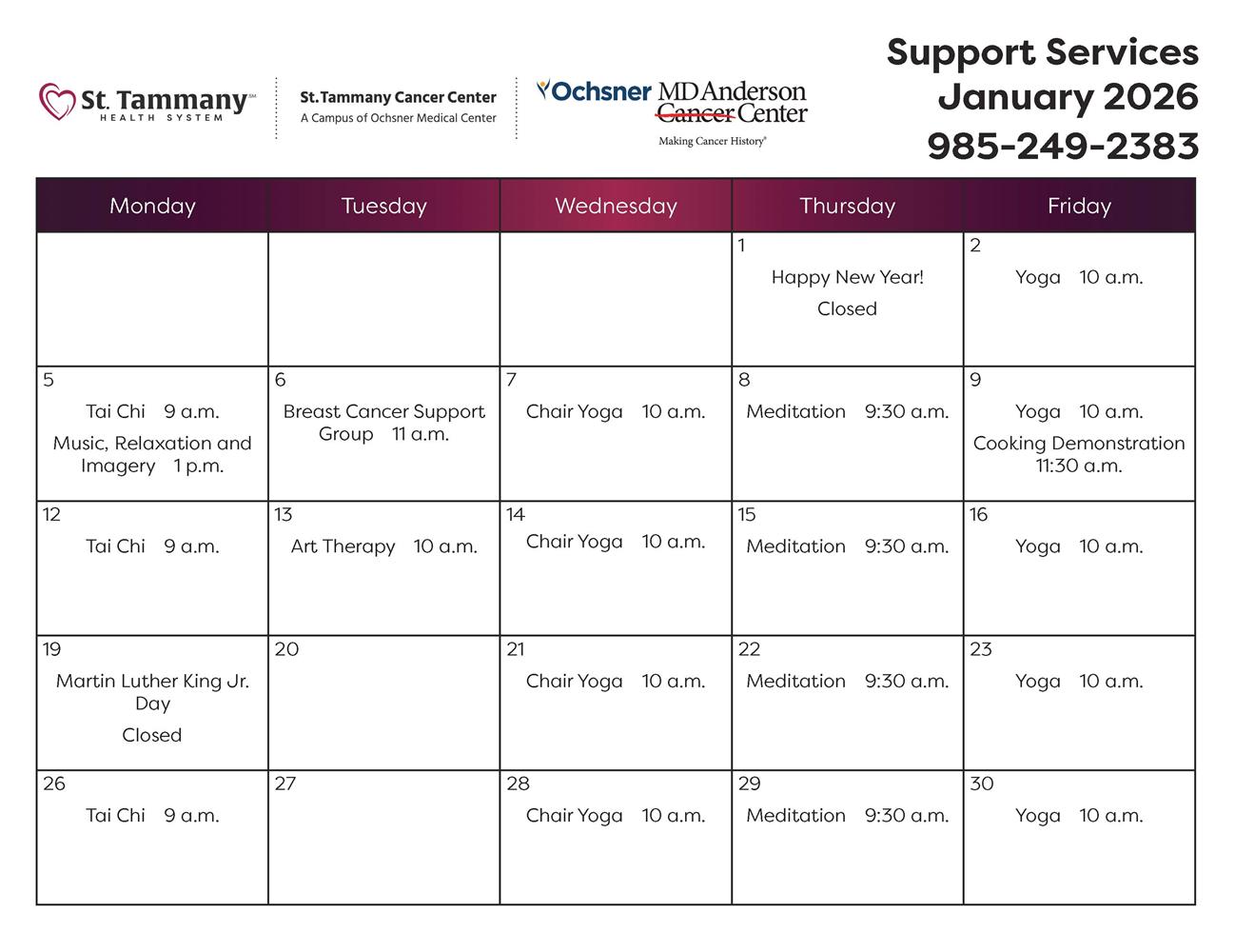 As part of its mission to treat the whole patient, St. Tammany Cancer Center – A Campus of Ochsner Medical Center, hosts free monthly classes on a variety of topics – from meditation to tai chi to music therapy and more – for diagnosed cancer patients.