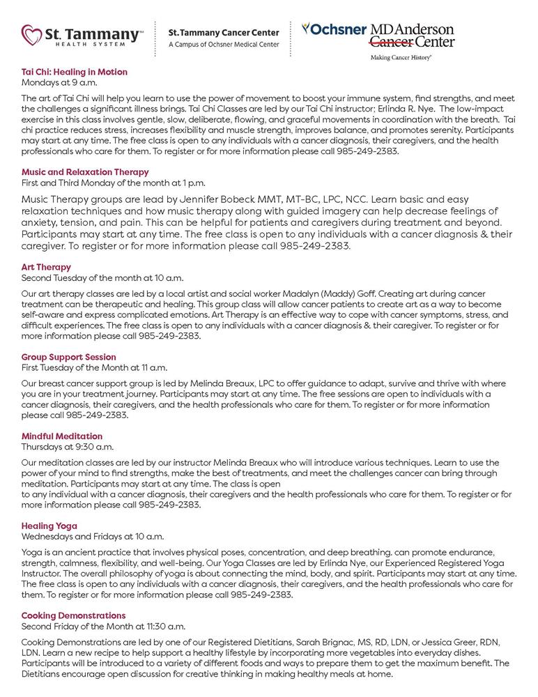 To register to attend any of the classes listed, call the cancer center at (985) 249-2383 and ask for Integrative Oncology.