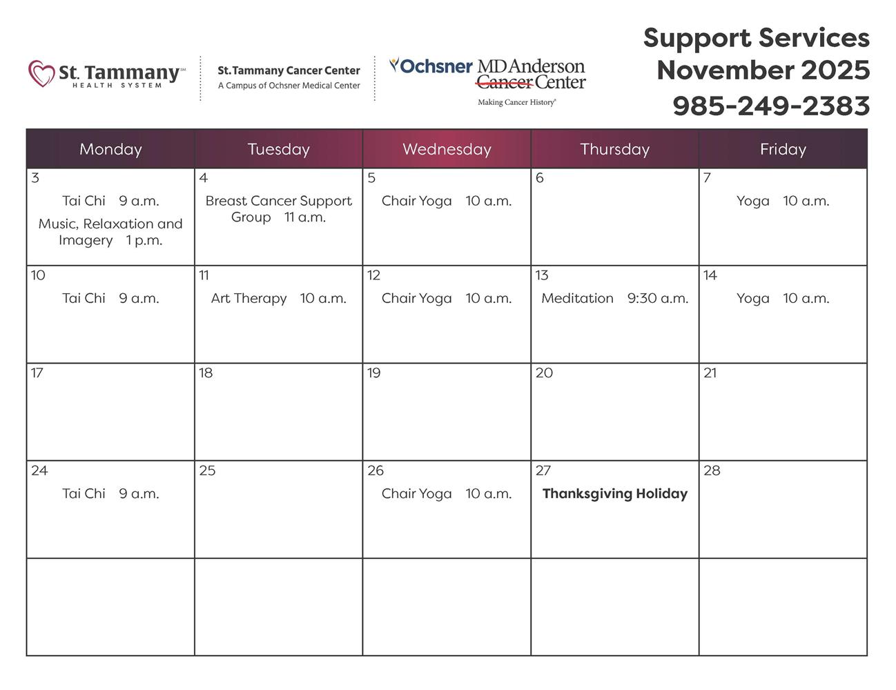 As part of its mission to treat the whole patient, St. Tammany Cancer Center – A Campus of Ochsner Medical Center, hosts free monthly classes on a variety of topics – from meditation to tai chi to music therapy and more – for diagnosed cancer patients.