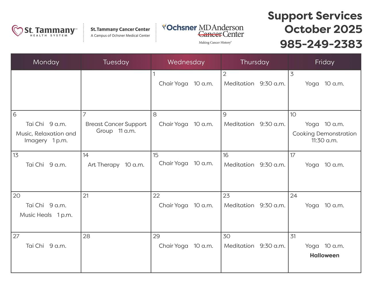 As part of its mission to treat the whole patient, St. Tammany Cancer Center – A Campus of Ochsner Medical Center, hosts free monthly classes on a variety of topics – from meditation to tai chi to music therapy and more – for diagnosed cancer patients.