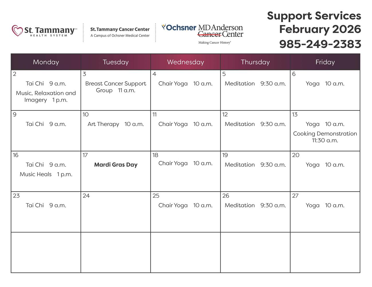 As part of its mission to treat the whole patient, St. Tammany Cancer Center – A Campus of Ochsner Medical Center, hosts free monthly classes on a variety of topics – from meditation to tai chi to music therapy and more – for diagnosed cancer patients.