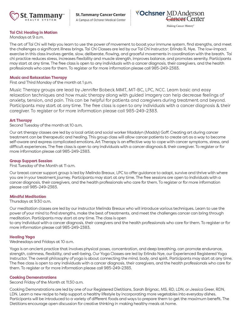 To register to attend any of the classes listed, call the cancer center at (985) 249-2383 and ask for Integrative Oncology.