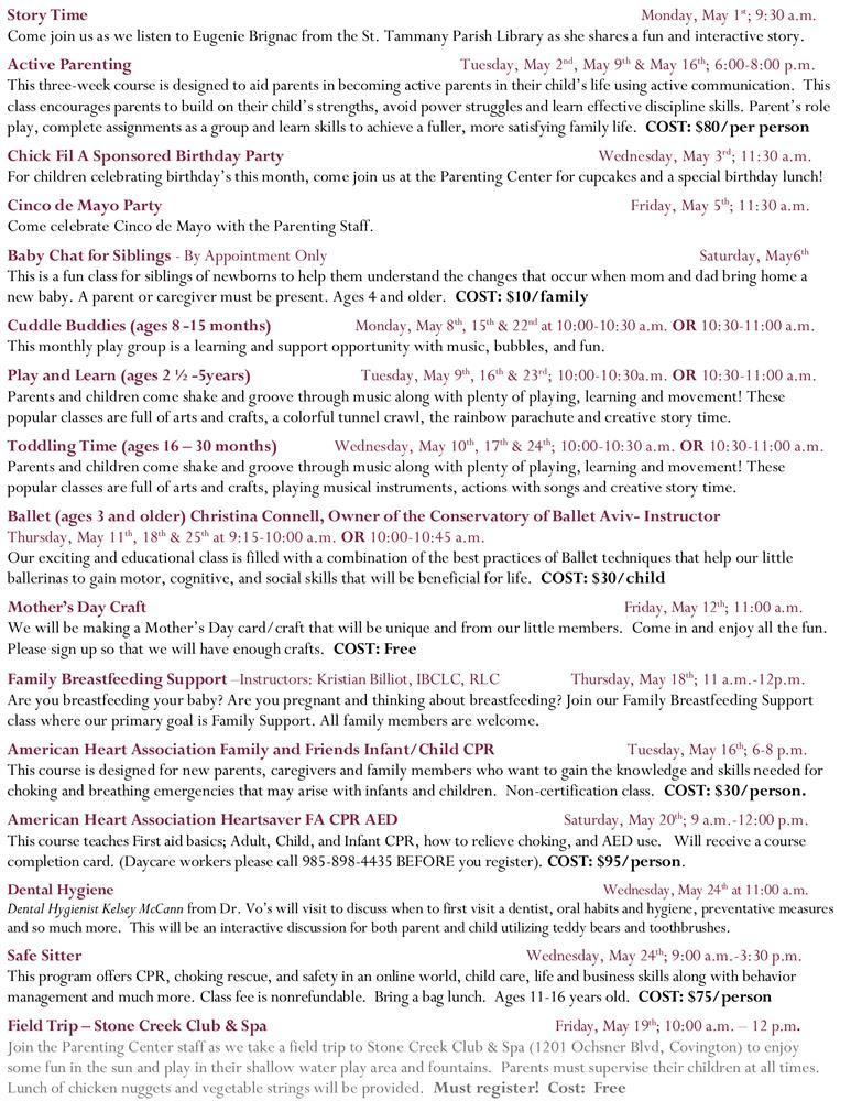 Scroll down for a quick look at the events and activities on tap for May 2023 at the St. Tammany Parenting Center.