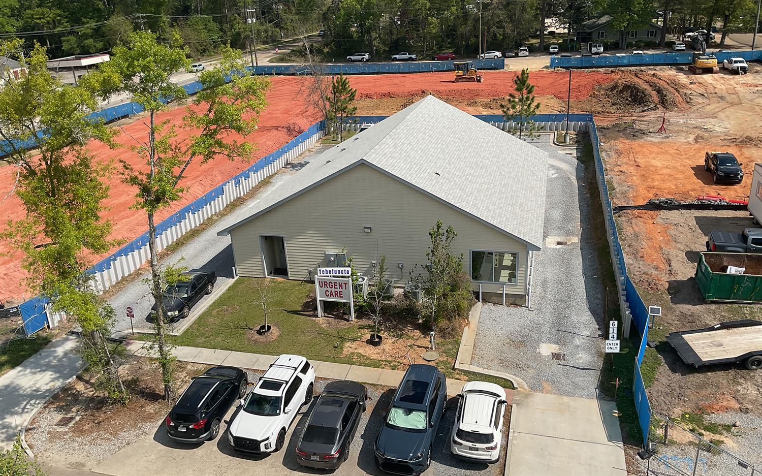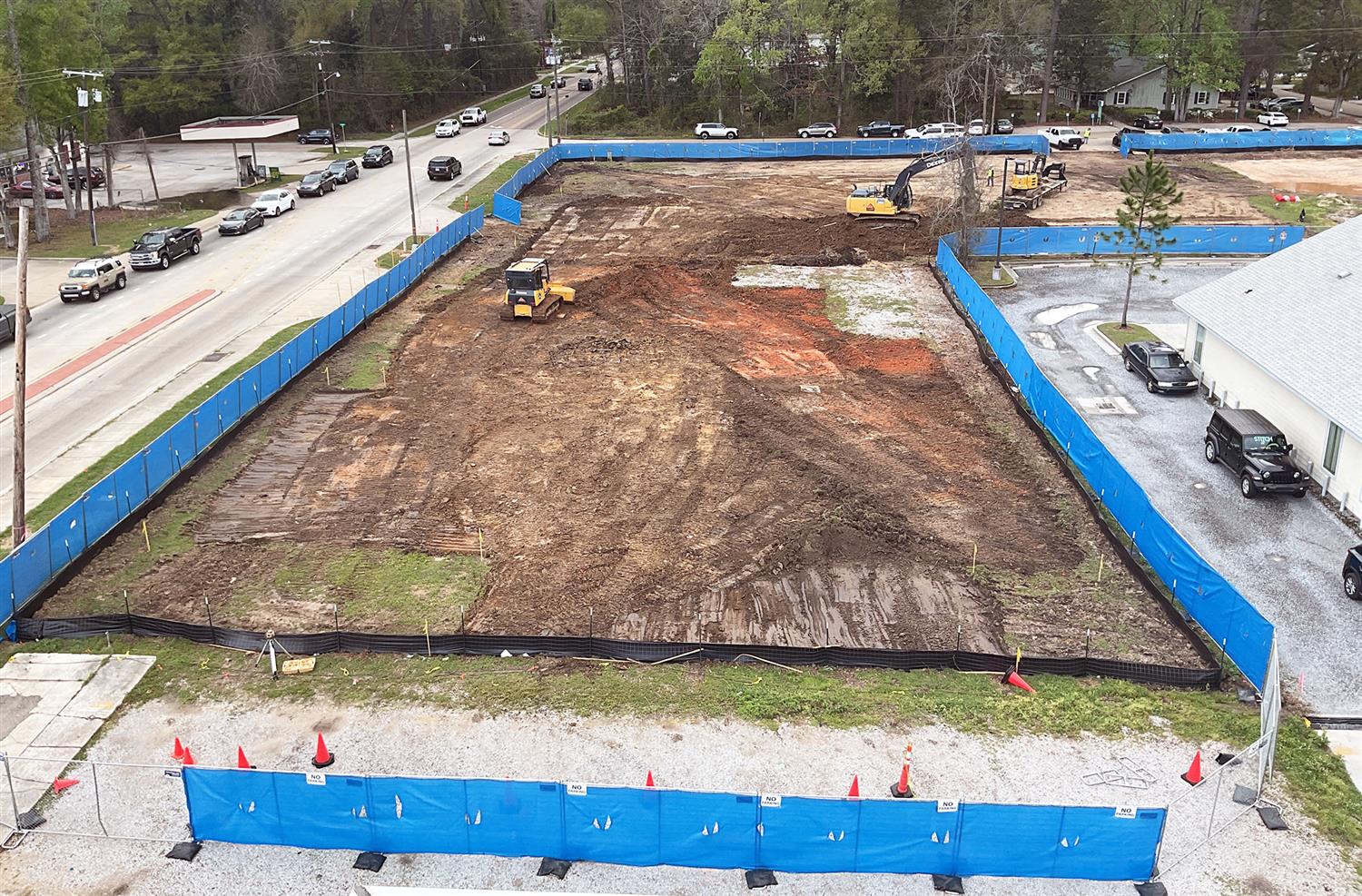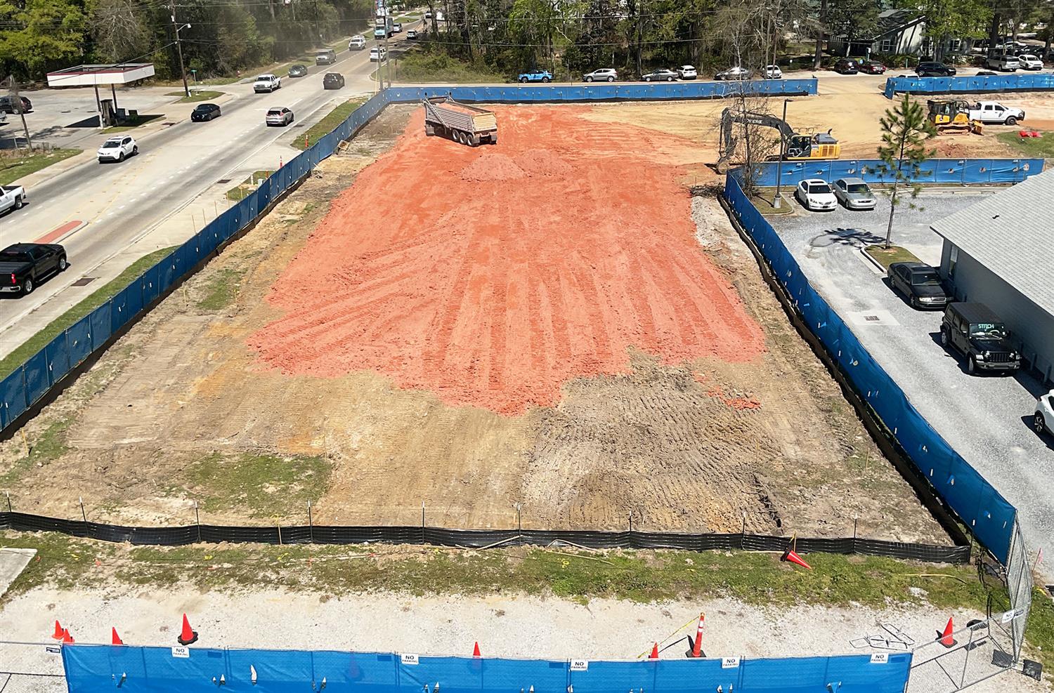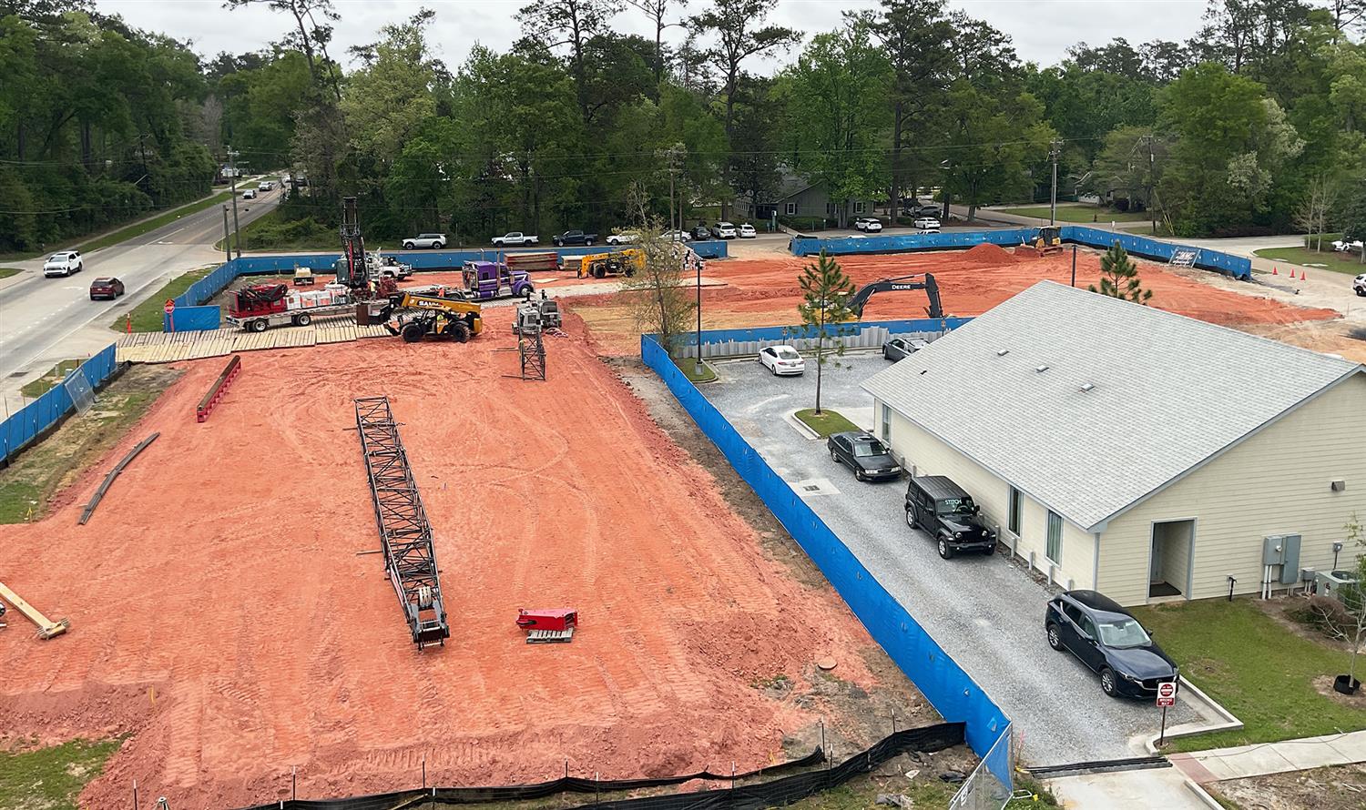 A bird’s-eye view of the site of the future St. Tammany Health System parking garage, as seen Thursday, March 26, 2026. Sheet piles have been installed around the privately owned Tchefuncte Urgent Care building, and construction fencing rings the perimeter of the garage site while dirt work continues. (STHS photo)